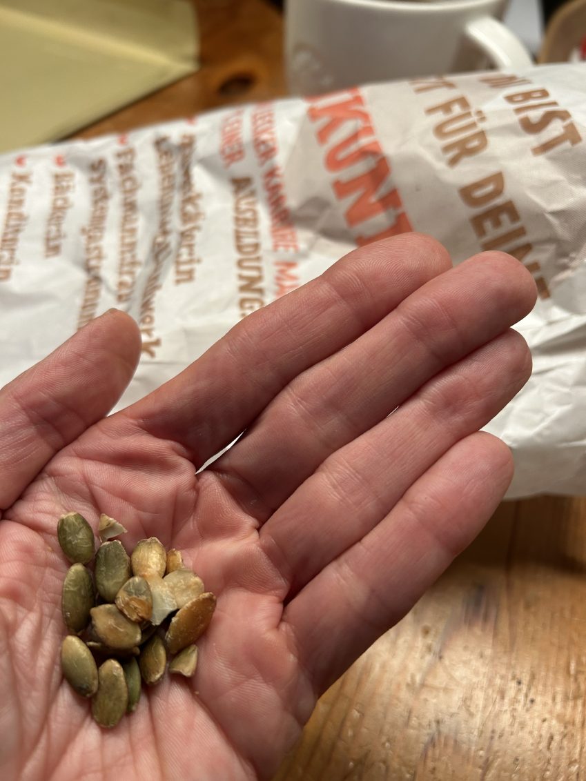 So liebe ich es zum Beispiel, wenn ich mir ein Kürbiskern-Brötchen kaufe, dieses dann aus der Tüte geholt und genüsslich gegessen habe und dann mit Freude feststelle, dass auf dem Boden der Tüte noch ganz viele Kürbiskerne liegen, die darauf warten und hoffe, auch noch in meinem Mund zu landen.