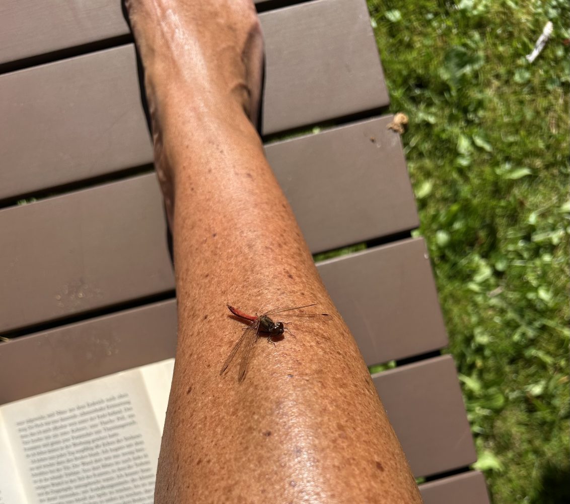 Diese kleine Heide-Libelle fand meine Haut anscheinend ziemlich einladend, um eine Weile darauf zu sitzen, sich zu sonnen, auszuruhen und mit nickendem Köpfchen die Umgebung anzuschauen.